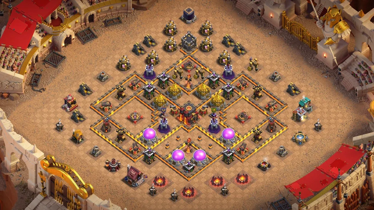 A: This TH10 Anti-2 Star War Base is excellent for CWL and Clan Wars. Diamond design, mixed Infernos, Tesla farm, and X-Bow islands make 2-stars difficult.