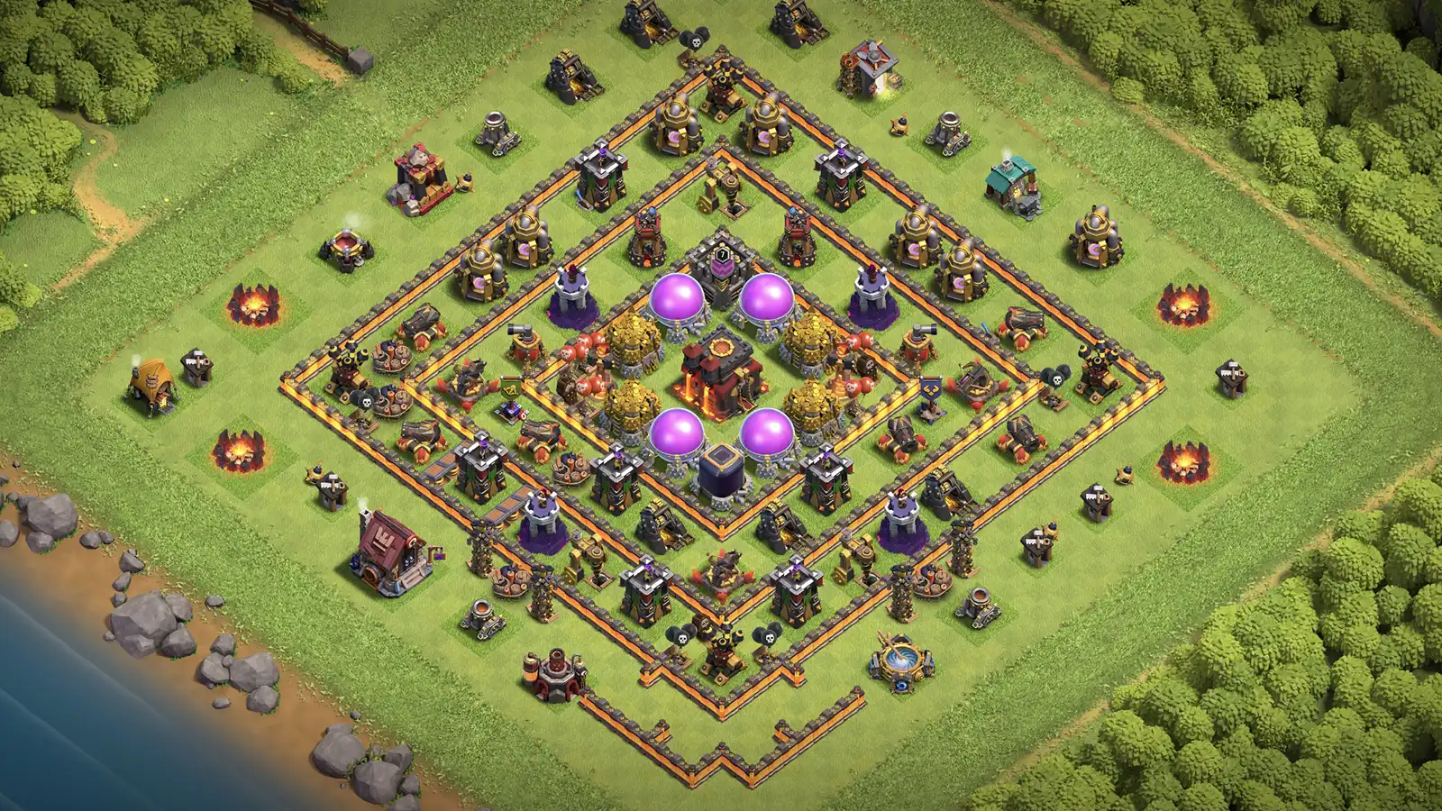 Best for: TH10 farmers wanting a base that spreads loot, uses Infernos for core protection, and makes 3-stars harder.