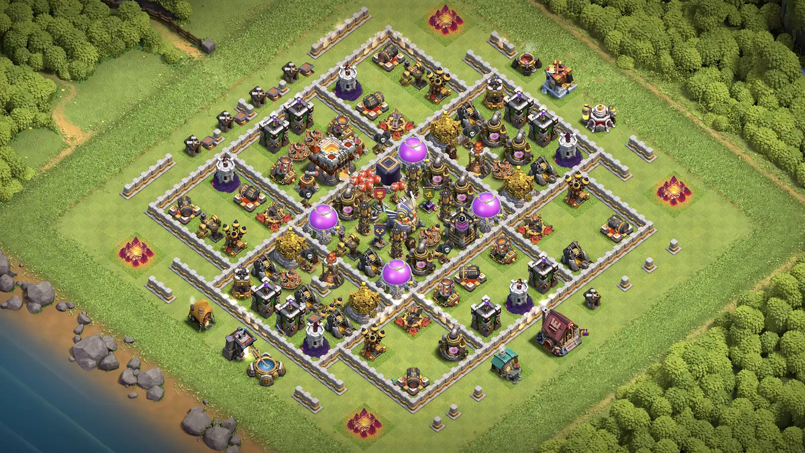 Best for: TH11 war players wanting a base that pulls troops away from TH and defends against Dragons and Witches.