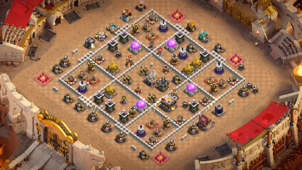 A: This TH11 Anti-3 Star CWL Base is excellent for Clan War League. Protected Infernos, Giant Arrow blocking, and Tesla + Prince Dragon counter make 3-stars extremely difficult.