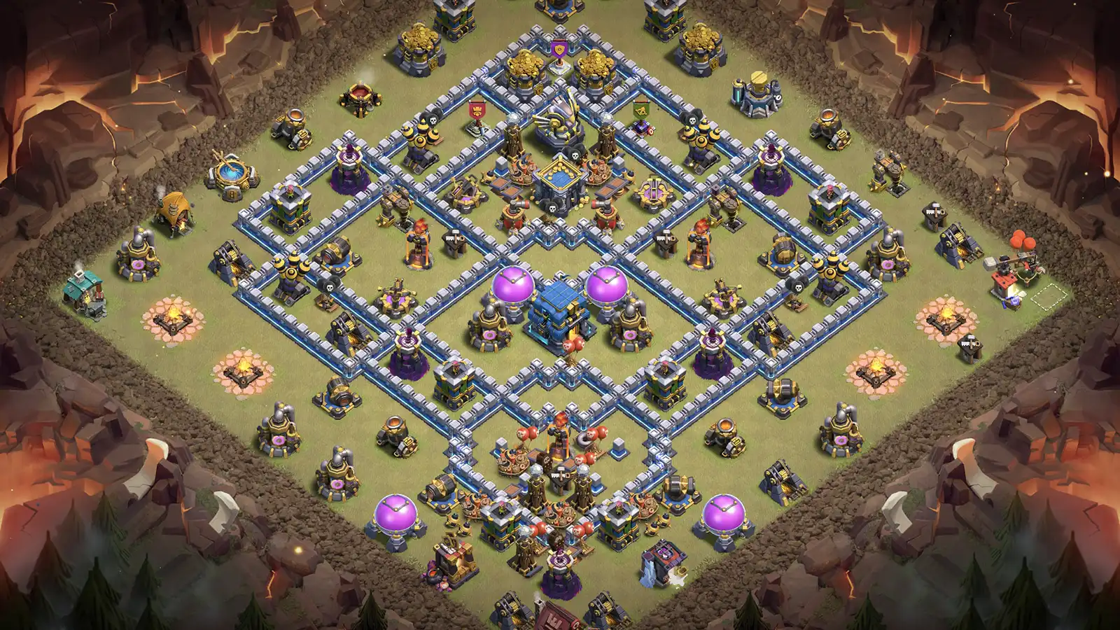 This TH12 CWL base make for anti-3, design by a trap and Tesla setup that counters Queen Charges, Dragons, and Pekka Smash.