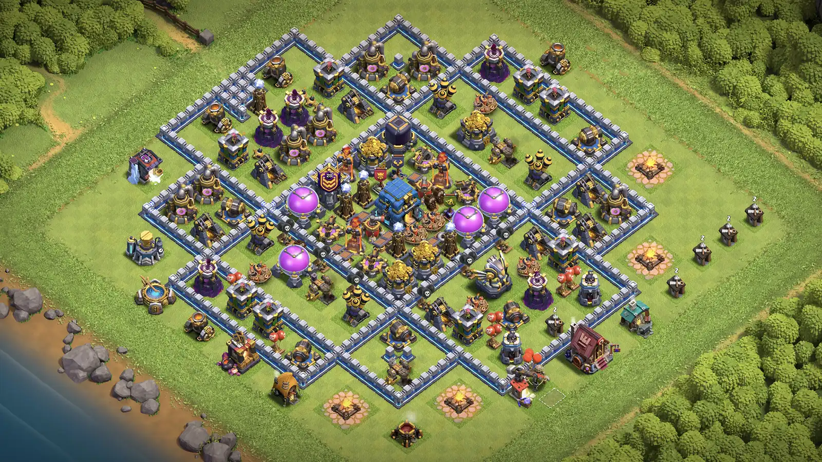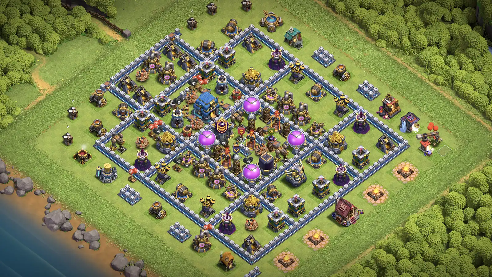 Best for: TH12 war players wanting a base that defends Queen Charge, LavaLoon, Hogs, and Dragons.