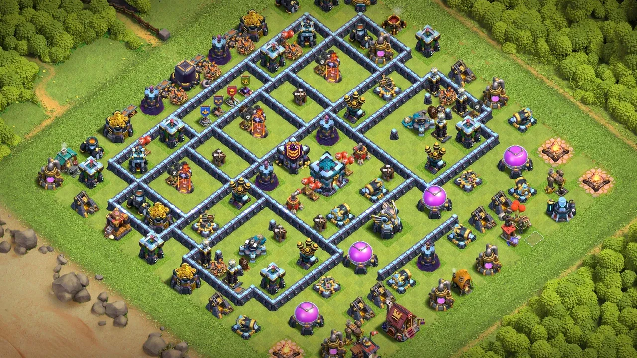A: This TH13 Anti-2 Star Trophy Base is excellent for Ranked Battles. Grouped heroes on back side, wide Inferno coverage, and protected Town Hall make 2-stars difficult.