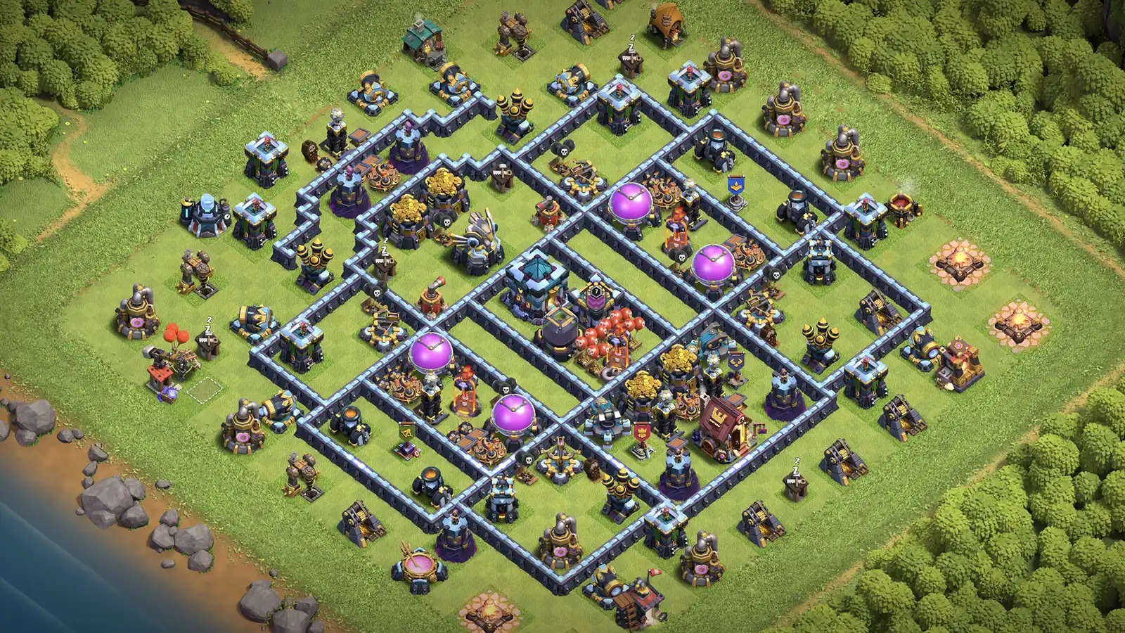 Best for: TH13 trophy pushers wanting a base with hero support, Inferno coverage, and strong anti-air for Ranked Battles.