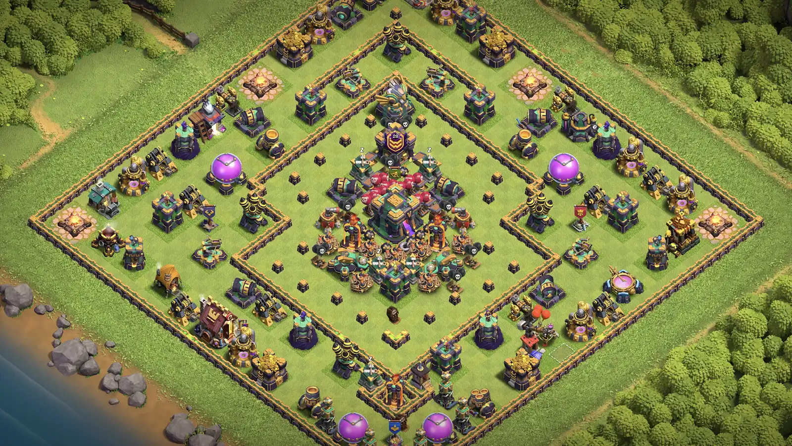 This TH14 trophy base make for anti-2, design by a heavily trapped core that protects the TH with defenses that disrupt enemy attacks.