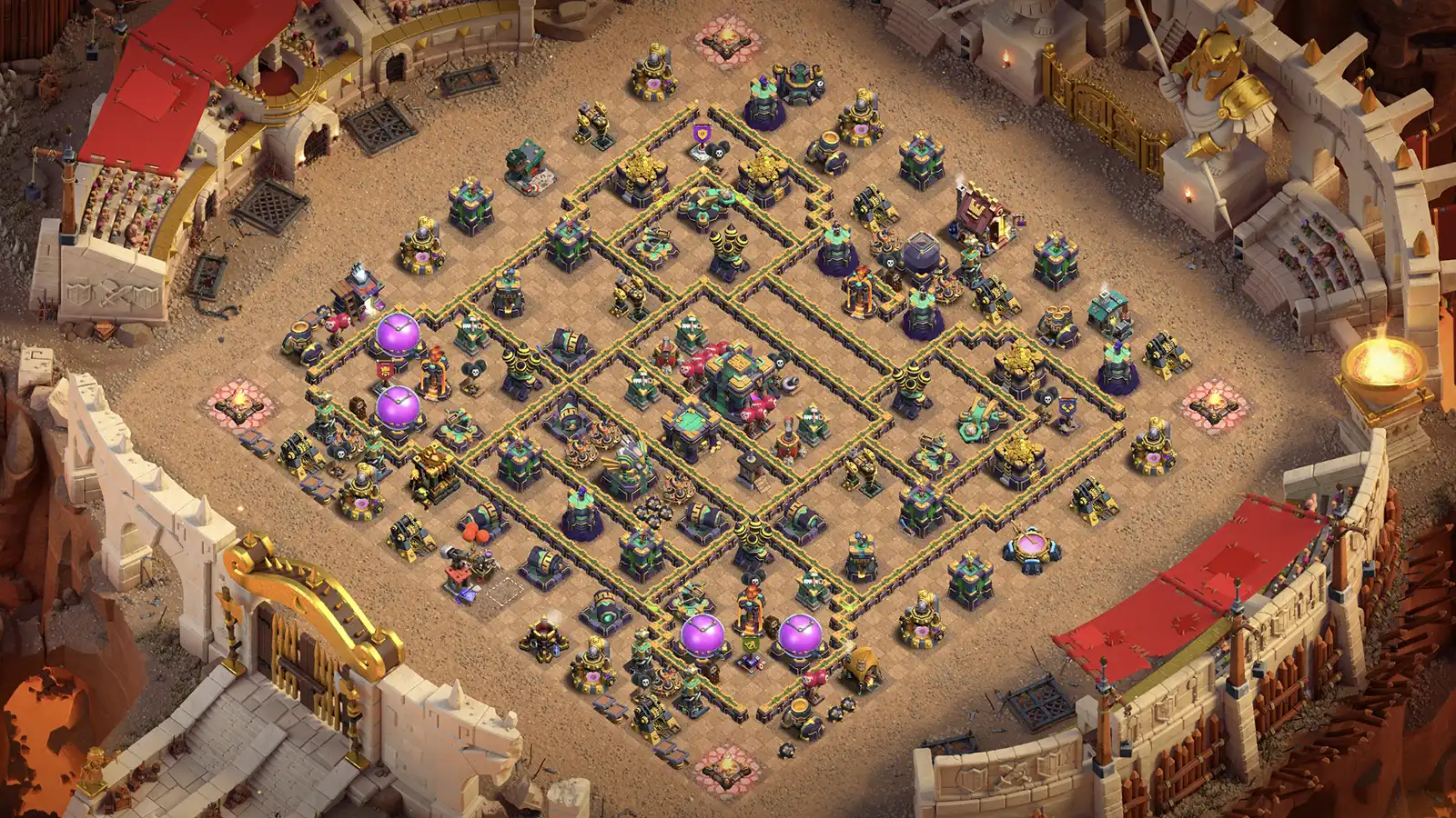This TH14 Anti-3 CWL Base uses traps and baits to stop 3-star attacks in CWL. The area behind Town Hall punishes Super Archer Blimp attacks. Traps outside walls break funneling, making troops walk wrong. Each corner and entry has extra traps that force attackers into bad paths.