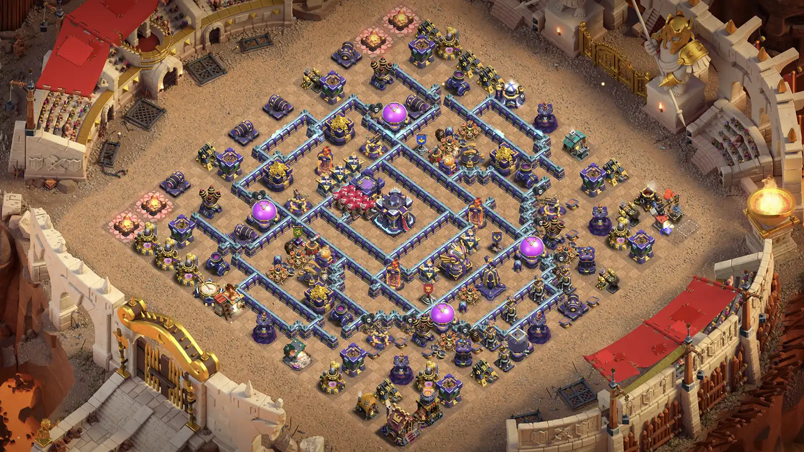 This TH15 Anti-2 Trophy Base makes the Town Hall hard to reach. Multi Infernos near main entrances pull troops into danger early. Single Infernos on sides stop heroes from clean funneling. The Monolith in center protects Town Hall and breaks down large troop groups.