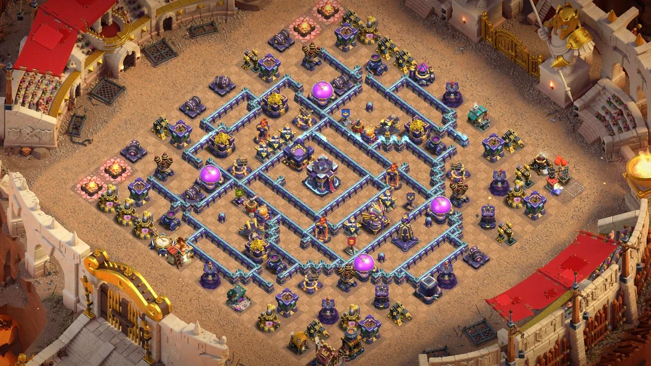 TH15 anti-2 star war base forces troops to move sideways instead of straight to Town Hall. Layout pulls both ground and air armies off their main path, breaking timing. Traps along side paths deal heavy damage before troops reach center, making core hard to enter.