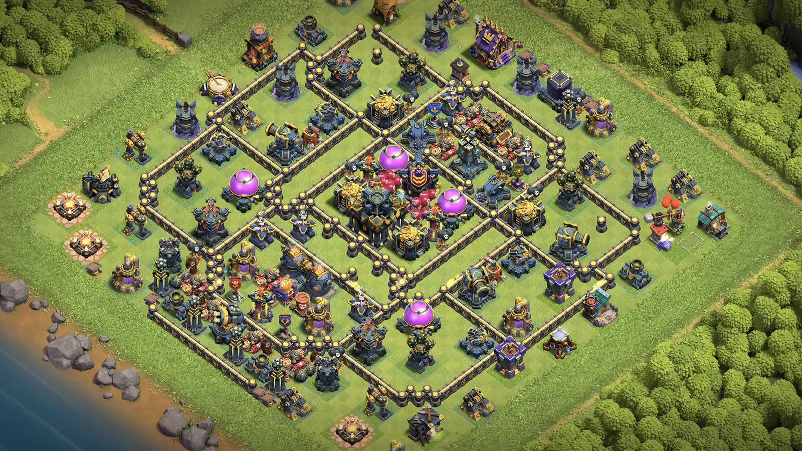 This TH17 farming base make for anti-3, design by a heavily defended core with a Rage Tower that counters heroes and Dragons.