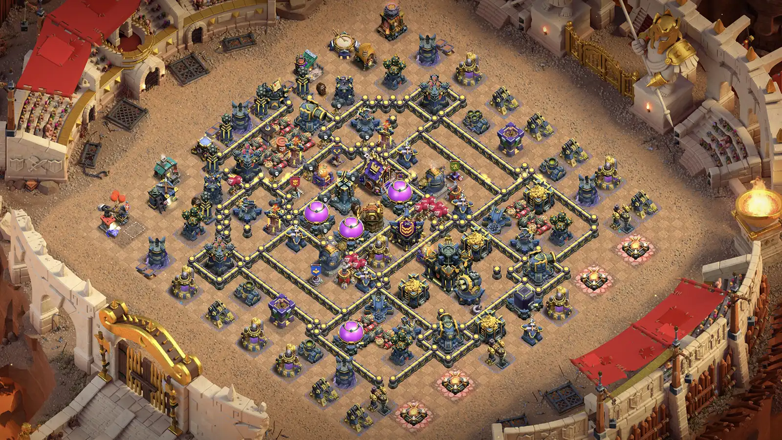 This TH17 trophy base make for anti-2, design by a heavily defended core with Spell Towers and baits to counter hero attacks.