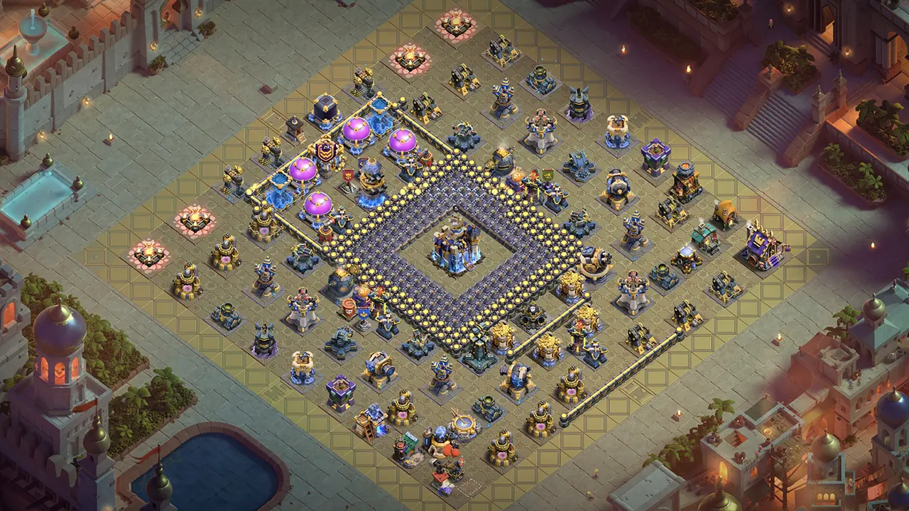A: This Bomb Hive Ranked Base is one of the strongest TH18 Legend League bases. Town Hall isolation forces long pathing while Bomb Hive damages Healers. Proven defense logs show consistent 1-star results against top attackers.