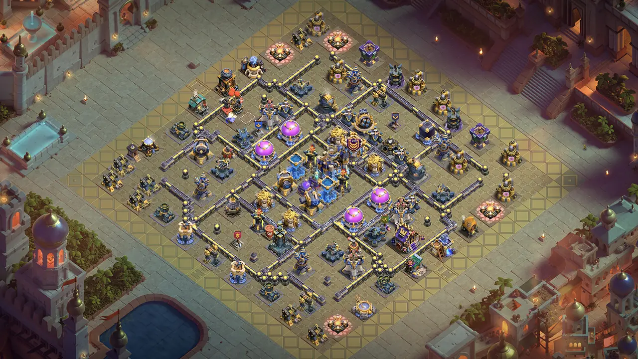 A: This TH18 Anti-2 Star Farming Base is excellent for protecting loot. Storages inside walls with splash defense coverage punish farming troops. Invisibility and Rage Towers disrupt attack timing for consistent defense.