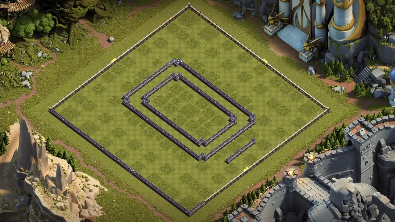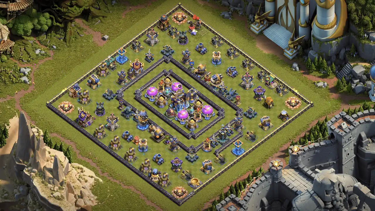 This TH18 Anti-2 Farming Base keeps the Town Hall at the center with all resource storages tucked under Invisibility Spell coverage, making it tough for farming strategies to grab loot. Wide compartments counter mass Valkyries and Earthquake Spell spam by spreading out value. Valkyries struggle to get decent returns, keeping resources safe inside the base. The layout also holds up well against Dragon spam, with Seeking Air Mines positioned to bait Battle Blimps in Dragon strategies.