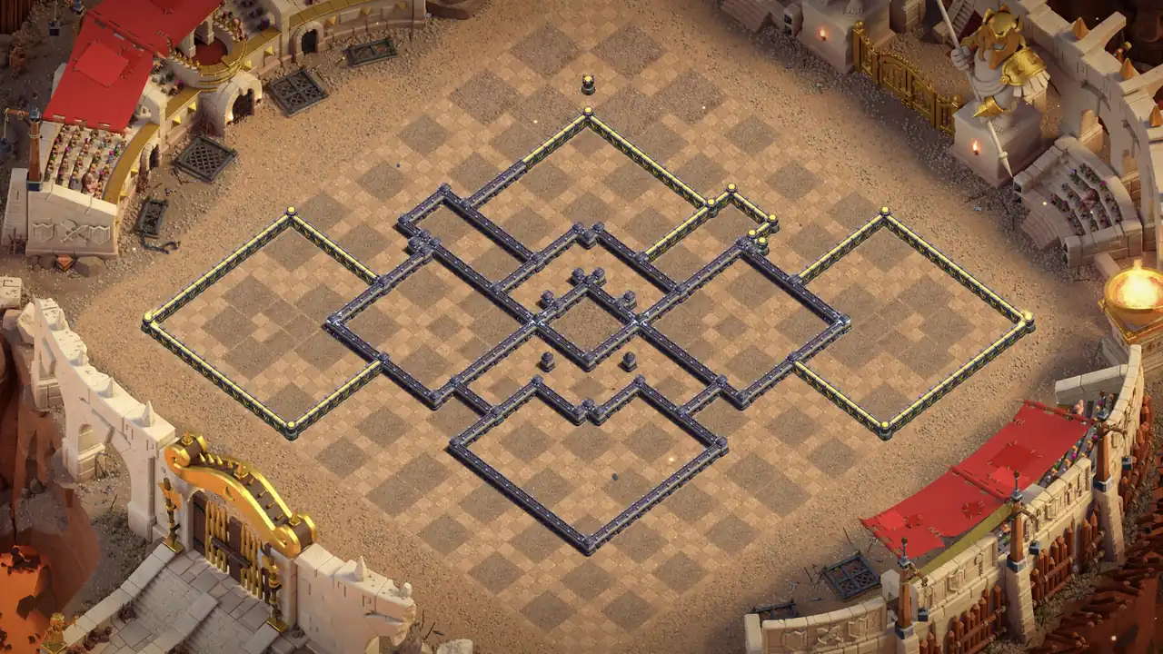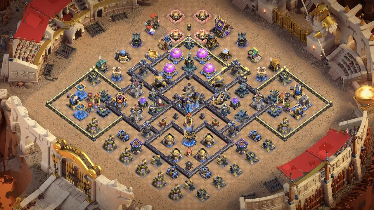 This TH18 Anti-2 War Base puts the Town Hall at the center with dead-zone spacing, giving attackers a hard time getting past one star. The Roaster paired with a Rage Tower creates a deadly compartment that punishes troops pushing in. High-DPS defenses sit on the edges to mess up Warden Walk Fireball pathing. Most compartments use 5-tile gaps to keep Throwers out of range, while Spring Traps bait Throwers and Seeking Air Mines pick off Healers.