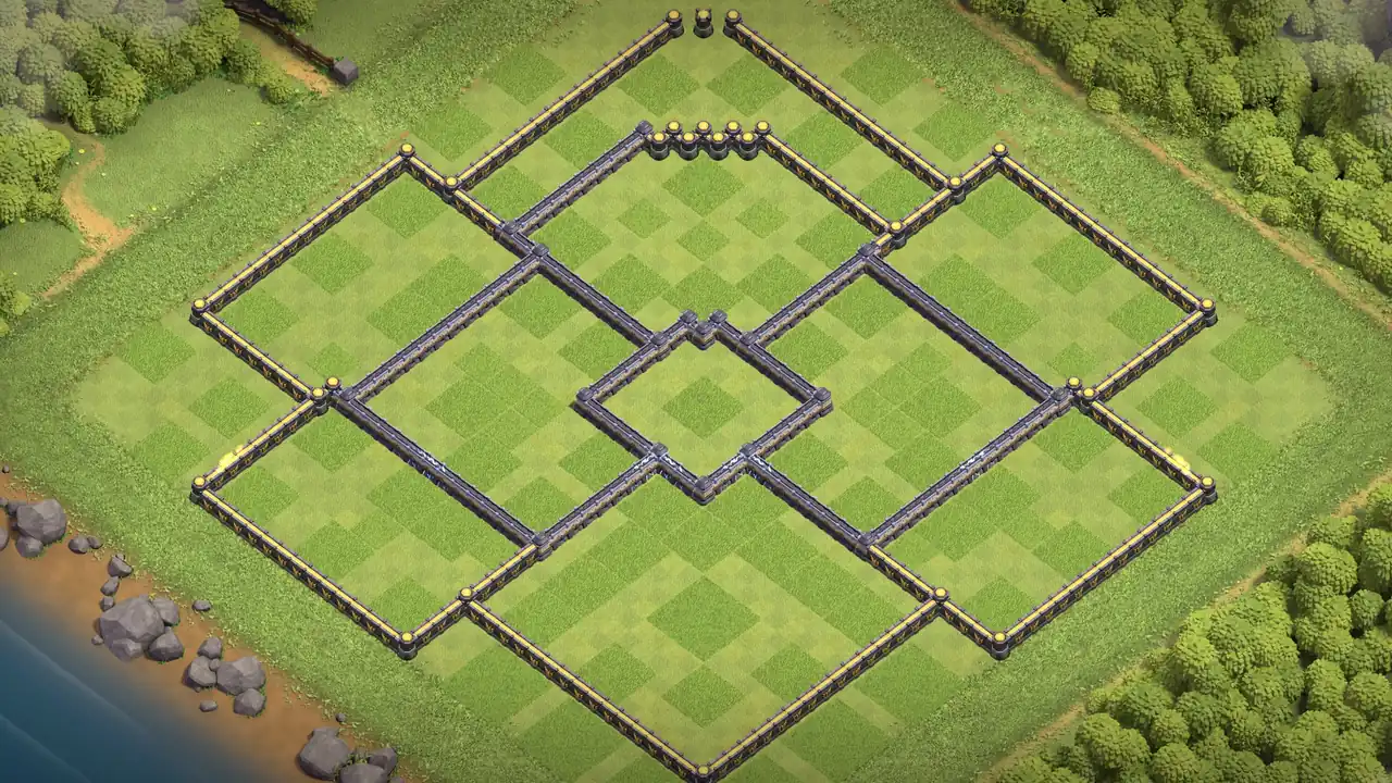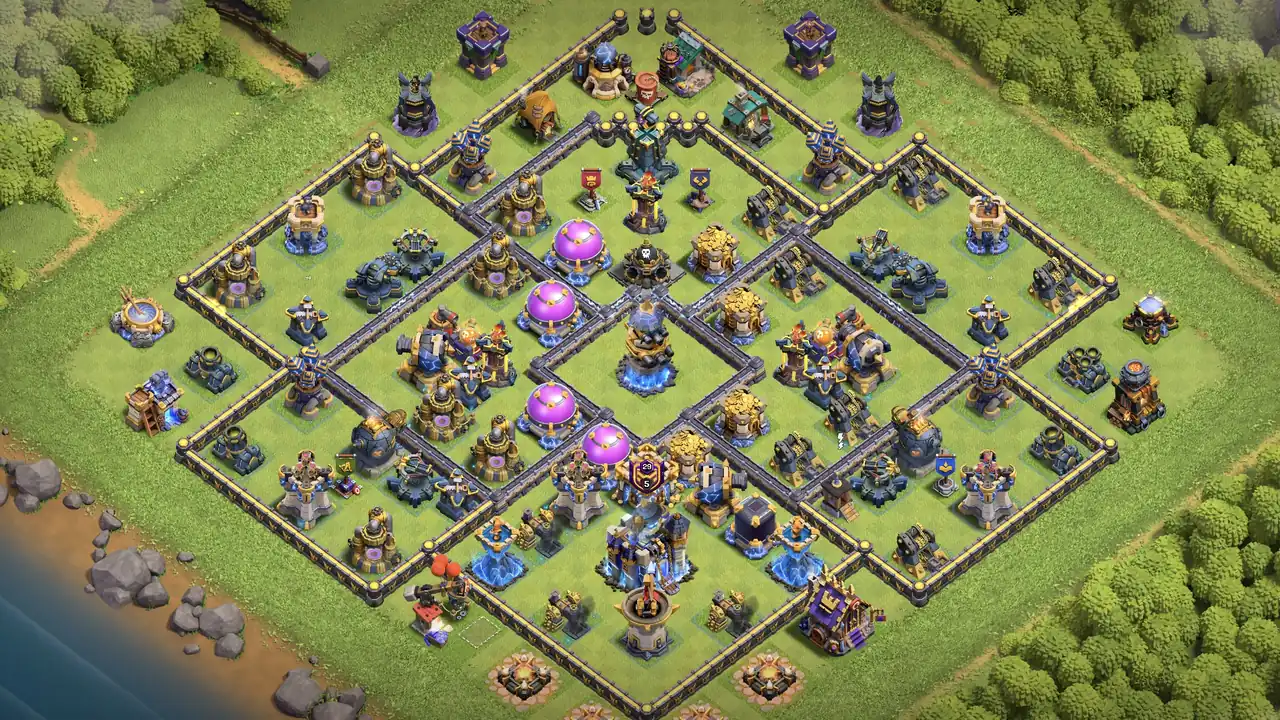 A: This TH18 Anti-3 Star Bomb Hive Farming Base is excellent for preventing full clears. Diamond ring core, Multi Inferno + Ricochet layer, protected Bomb Hive, and Tesla farm make 3-stars extremely difficult.