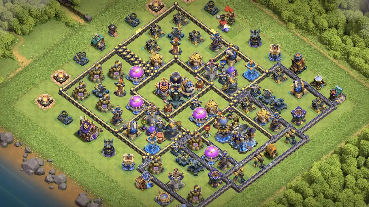 A: This TH18 Anti-3 Star Hero Bell Farming Base is excellent for preventing full clears. Edge TH with 5 tile gap, heavy TH zone, spread storages, and anti-Healer traps make 3-stars extremely difficult.