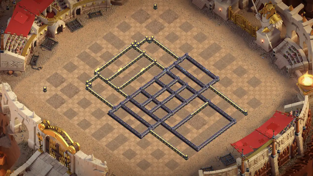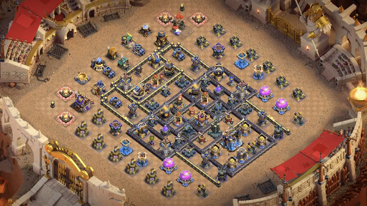 This TH18 Anti-3 CWL Base places the Town Hall at the edge with a Monolith sitting behind it for extra protection. The Lava Launcher at the core covers most of the base with splash damage. Key defenses are stacked at the core inside a double Rage Spell Tower compartment, making it deadly to push through. Warden Walk Fireball becomes risky against this layout. Attackers coming from the far side have a high chance of walking away with only one star.