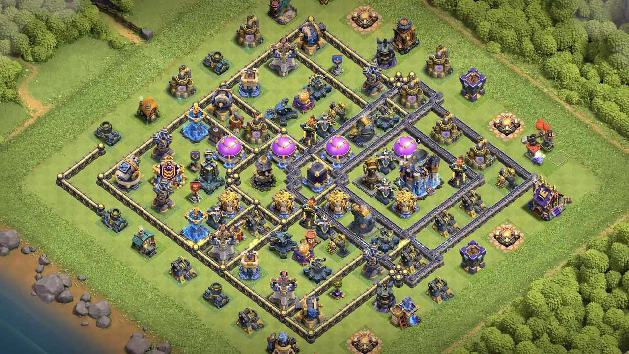 A: This TH18 Anti-3 Star Light Beam Farming Base is excellent for preventing full clears. Smasher + Light Beam team, core DE storage line, triple protection, and Champion bait make 3-stars extremely difficult.