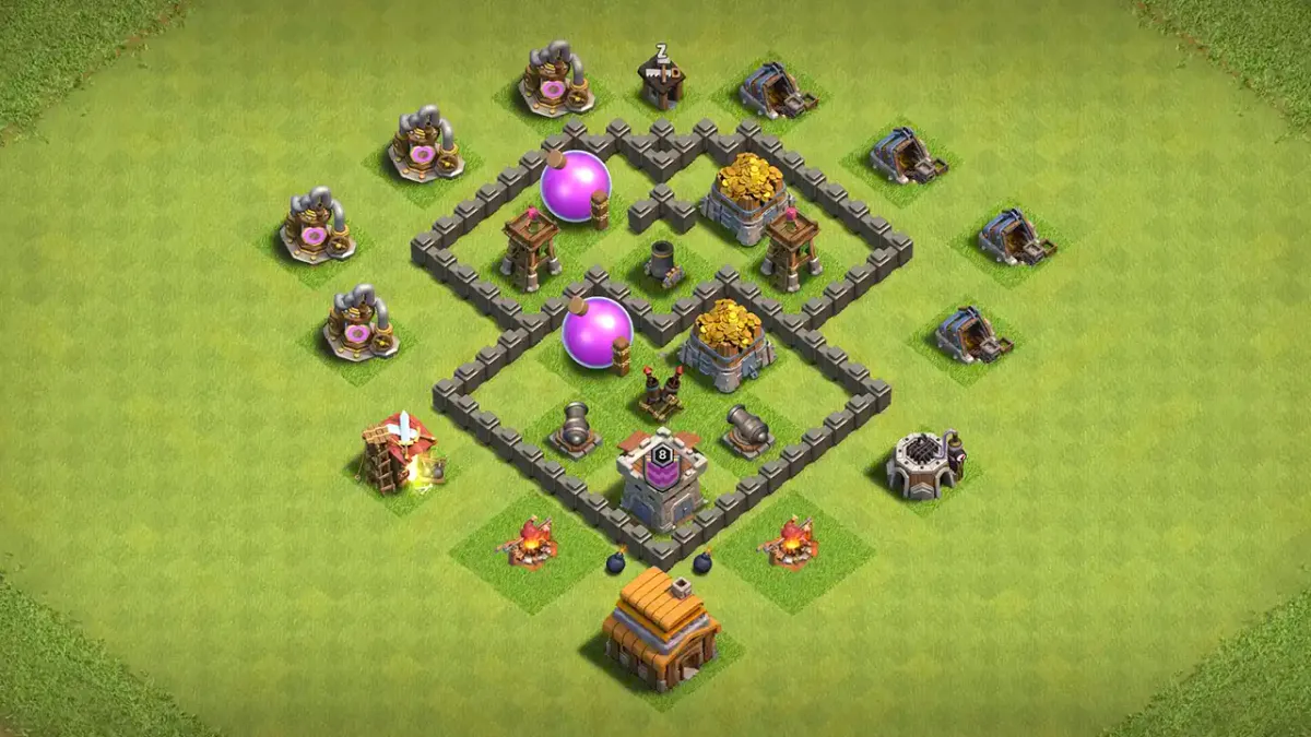 This Town Hall 4 farming base uses compact compartments to protect all storages inside walls. Air Defense sits in the core with Cannon and Spring Trap protection that catches Giants and keeps Air Defense alive to attack Balloons. Bombs outside near walls stop Wall Breakers from opening second layers. Fill Clan Castle to defend against mass Balloons.