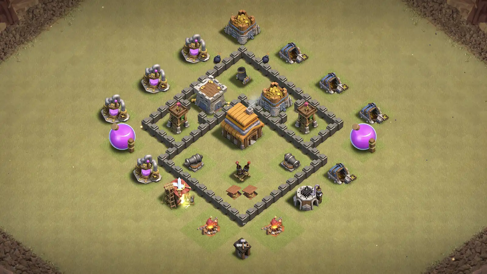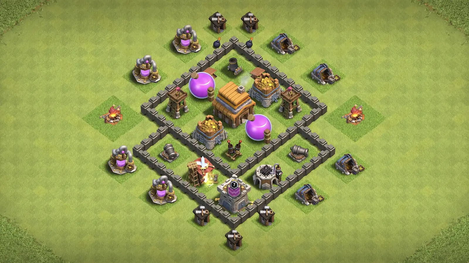 Best for: Players wanting a TH4 farming base that protects resources, slows ground troops, and punishes common low-tier strategies.