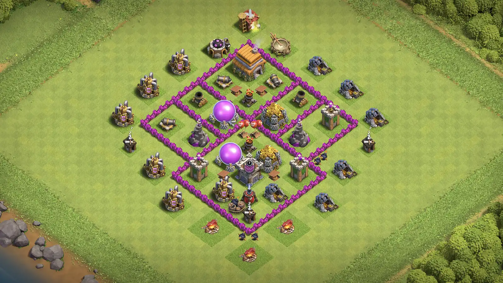 - The Air Sweepers are positioned to push troops away from the top, forcing enemies to deploy from a different side where they will face three Archer Towers last.