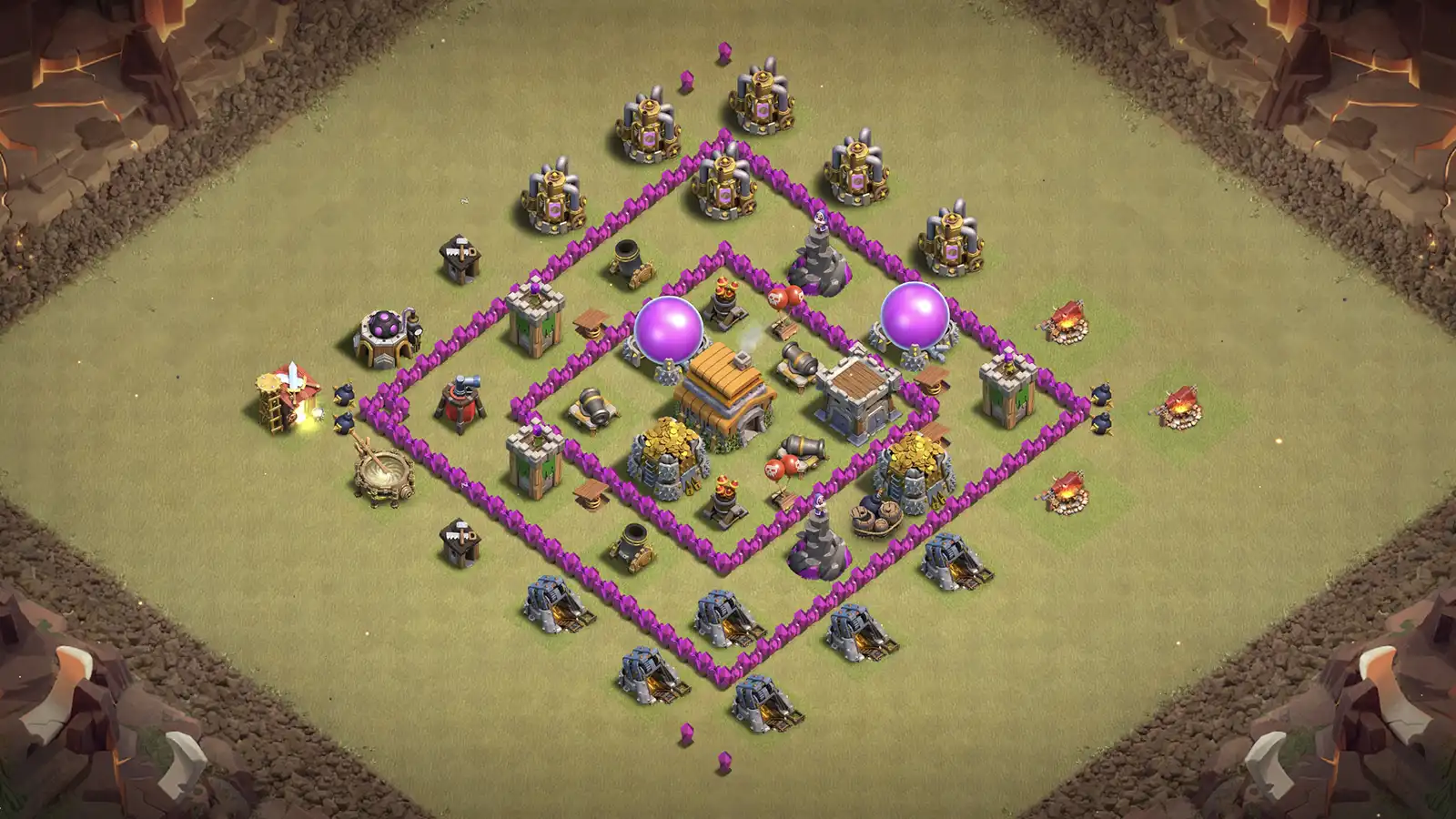 This town hall 6 war base make for anti-2, design by a ring layout with a central TH and defenses to handle Clan War attacks.