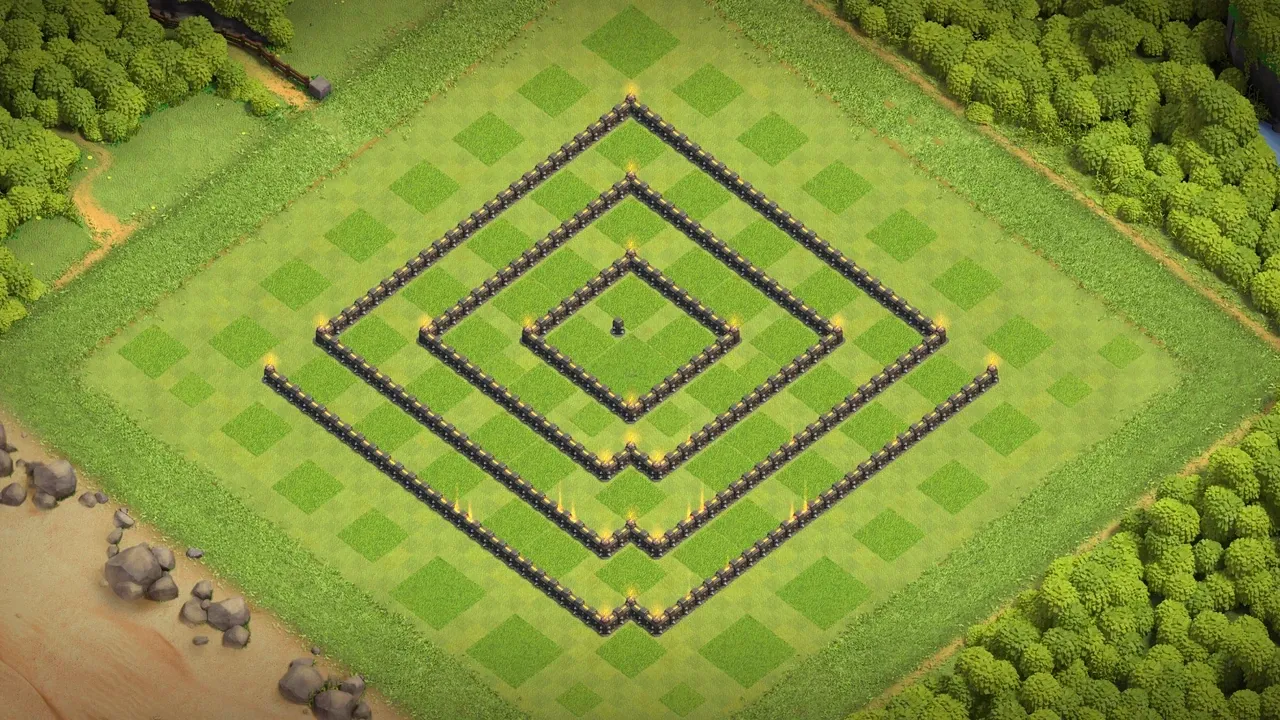A: Tight outer trash ring prevents free percentage. Attackers can't pick off buildings for easy progress without engaging defenses.