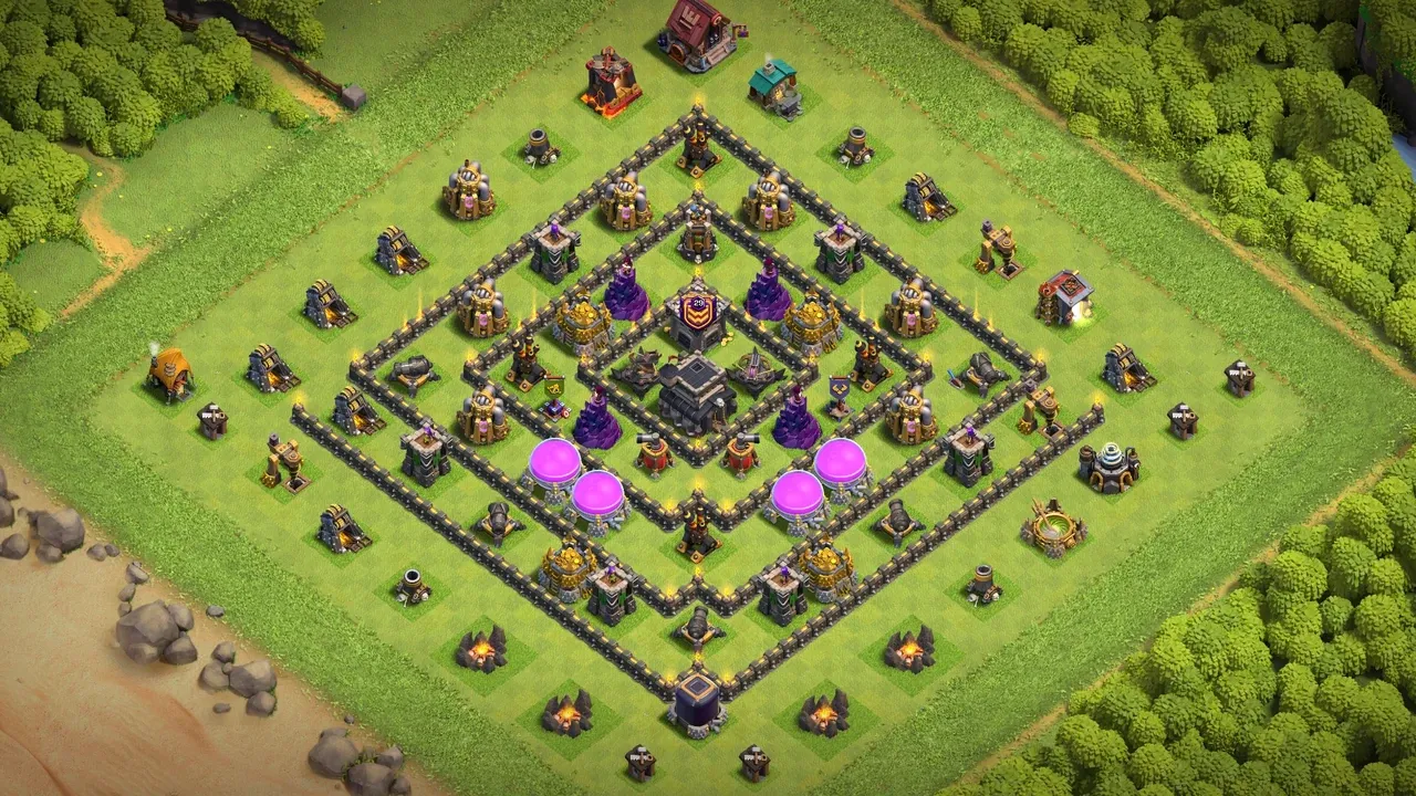 TH9 anti-2 star trophy base keeps Town Hall and X-Bows in the middle for steady damage to pushing troops. Compact ring layout forces attackers through the whole base, while tight trash ring prevents free percentage from outside. Lower TH attackers often struggle to reach Town Hall or earn a safe 2-star.