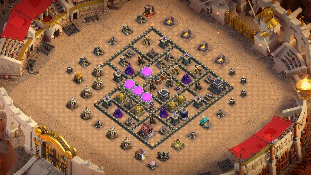 A: This TH9 Anti-3 Star CWL Base is excellent for Clan War League. Uneven box, Y-shaped Air Defenses, even DPS spread, and danger zones make 3-stars extremely difficult.