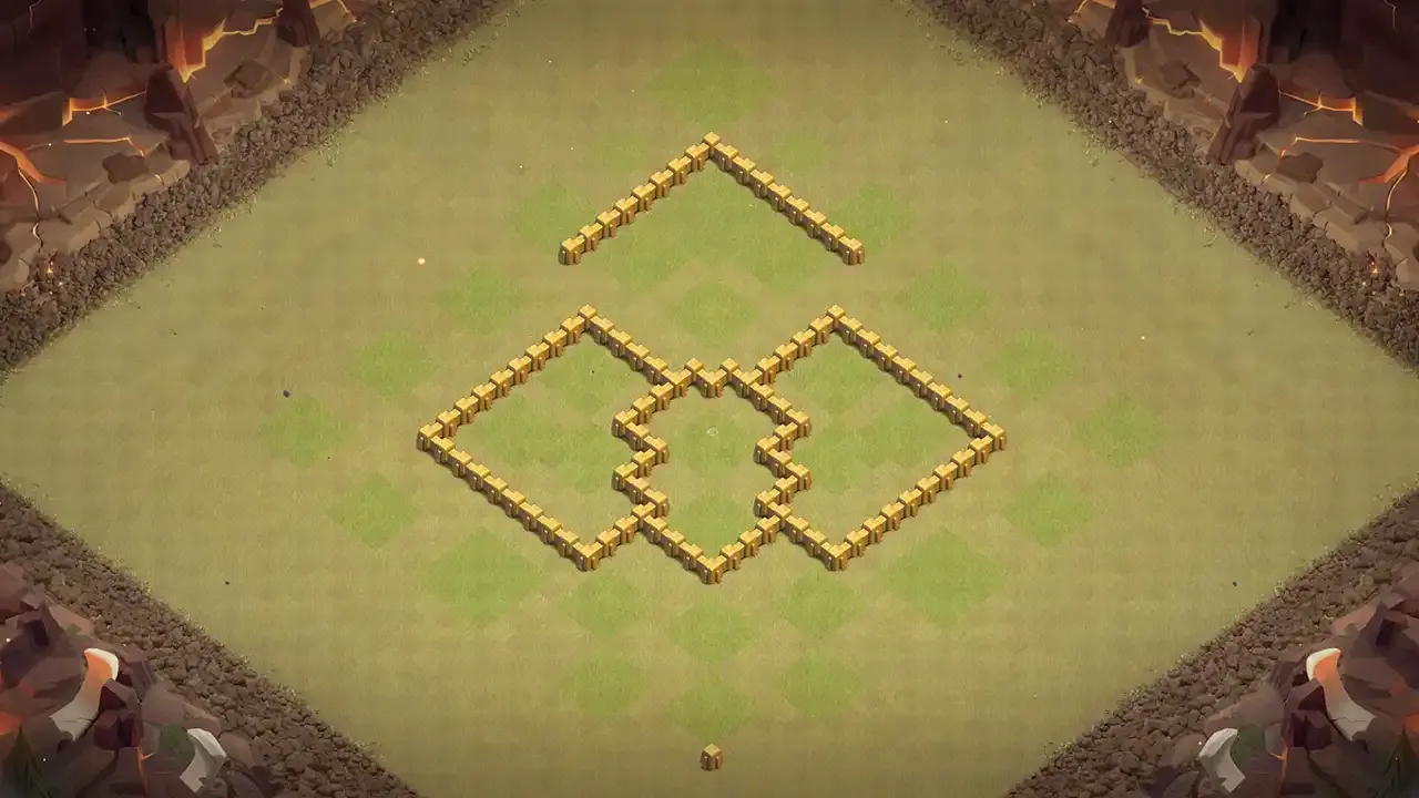 TH5 anti-3 CWL base with open compartment diamond design. Town Hall inside walls at bottom covered by Cannon and Archer Tower. Open compartments bait Giants into traps making attack planning harder. Wizard Tower at core makes damage to ground troops stuck at walls. Bombs placed to stop Wall Breakers from opening second wall layer.